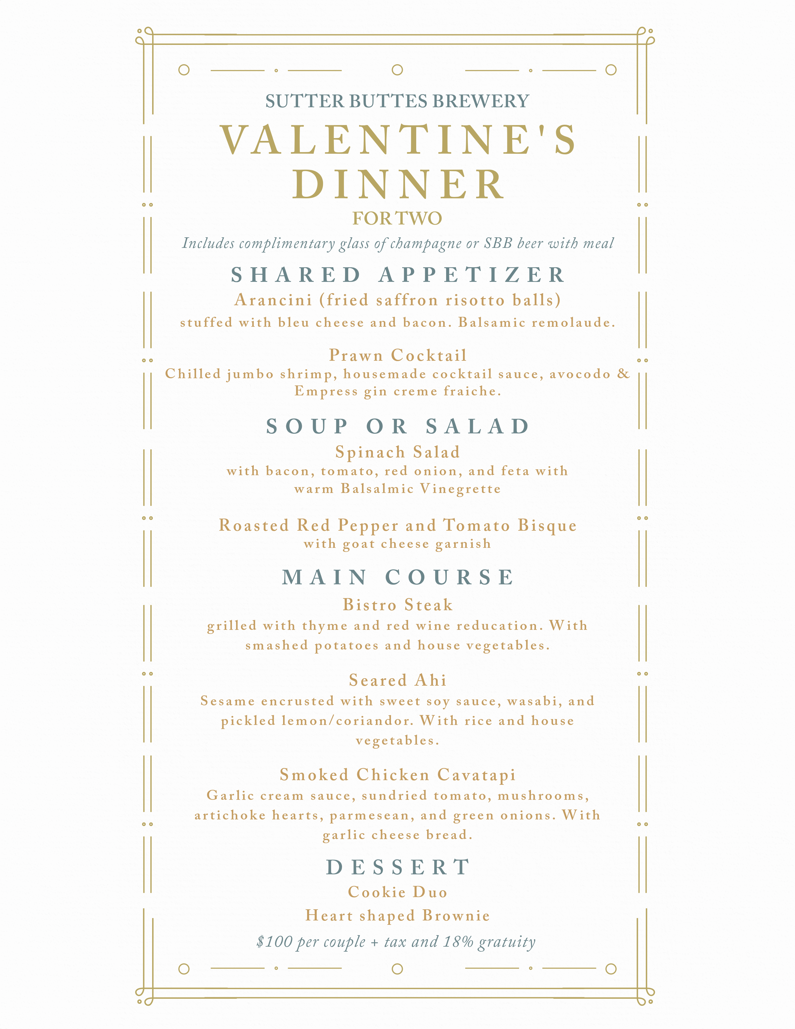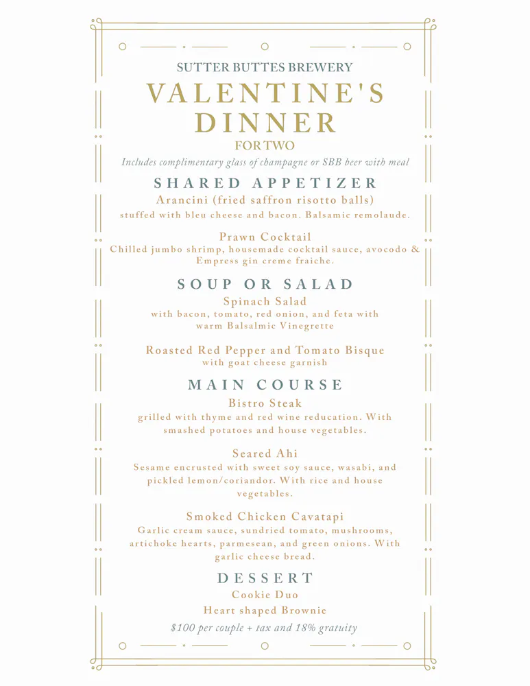 Your "ticket" purchase is a nonrefundable deposit for your reservation. The deposit amount will be credited toward your meal, so you will pay $75/couple the night of the event (plus tax and gratuity). A complimentary glass of champagne or Sutter Buttes Brewing craft beer is included with your meal.
